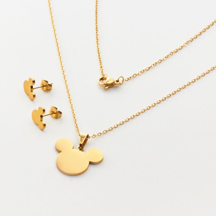 Komplet biżuterii ze stali chirurgicznej z kolczykami Myszka Miki w kolorze złotym 45cm