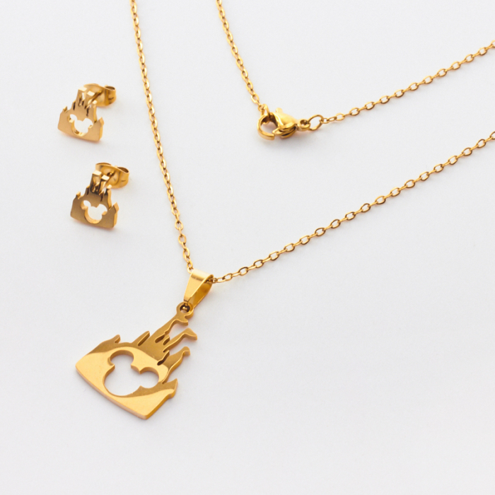 Komplet biżuterii ze stali chirurgicznej z kolczykami Myszka Miki w zamku w kolorze złotym 45cmTo estetyczny element biżuteryjny ze stali chirurgicznej 316L, chętnie wybierany do nowoczesnych projektów. W biżuterii handmade stal chirurgiczna 316L jest ceniona za dobry wygląd, odporność na korozję i wygodę codziennego użytkowania.Komplet biżuterii ze stali chirurgicznej 316L to spójnie zaprojektowany zestaw, który łączy estetykę z wygodą codziennego użytkowania. Dzięki dopasowanym elementom dobrze prezentuje się jako gotowa biżuteria i ułatwia stworzenie harmonijnej stylizacji.Rozmiar