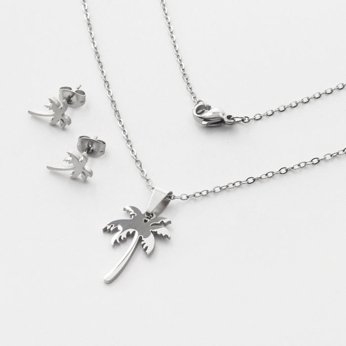 Komplet biżuterii ze stali chirurgicznej z kolczykami palma w kolorze srebrnym 45cm