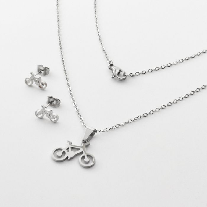 Komplet biżuterii ze stali chirurgicznej z kolczykami rowerek w kolorze srebrnym 45cm