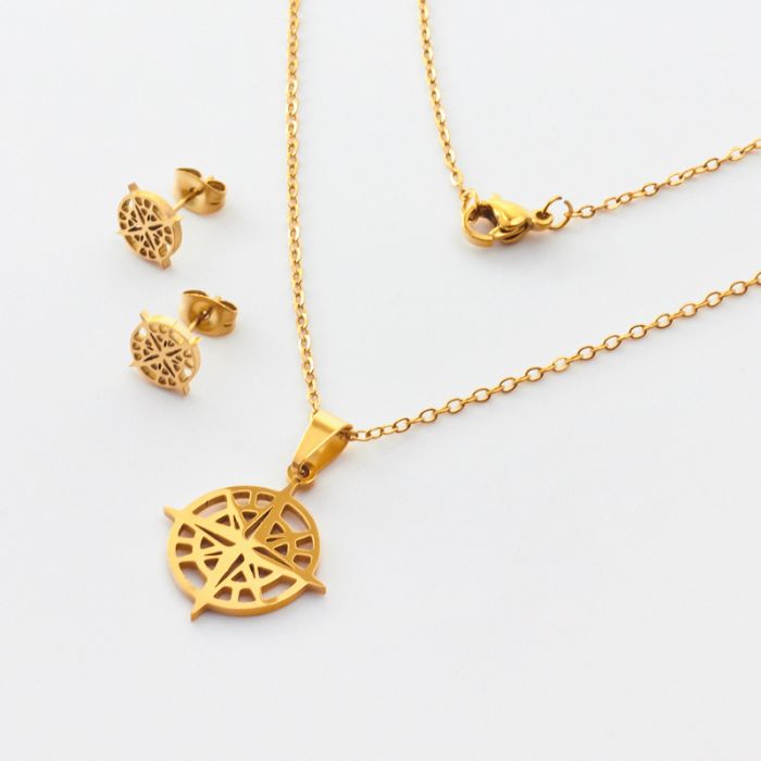 Komplet biżuterii ze stali chirurgicznej z kolczykami róża wiatrów w kolorze złotym 45cm