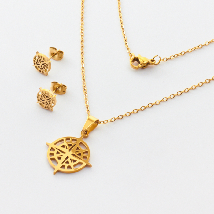 Komplet biżuterii ze stali chirurgicznej z kolczykami róża wiatrów w kolorze złotym 45cmTo dopracowany produkt ze stali chirurgicznej 316L, który łączy praktyczność z estetycznym wyglądem. Stal chirurgiczna 316L jest ceniona za odporność na korozję i estetyczny wygląd w codziennym użytkowaniu.Komplet biżuterii ze stali chirurgicznej 316L to spójnie zaprojektowany zestaw, który łączy estetykę z wygodą codziennego użytkowania. Dzięki dopasowanym elementom dobrze prezentuje się jako gotowa biżuteria i ułatwia stworzenie harmonijnej stylizacji.Rozmiar