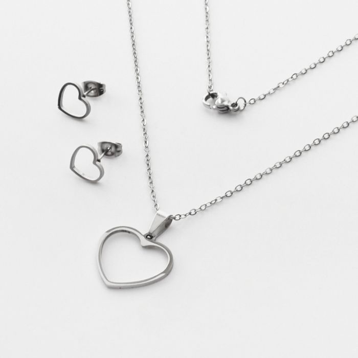 Komplet biżuterii ze stali chirurgicznej z kolczykami serce wycięte w kolorze srebrnym 45cm