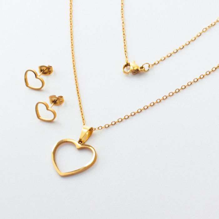 Komplet biżuterii ze stali chirurgicznej z kolczykami serce wycięte w kolorze złotym 45cmTo dopracowany produkt ze stali chirurgicznej 316L, który łączy praktyczność z estetycznym wyglądem. To materiał chętnie wybierany do biżuterii handmade ze względu na trwałość, estetykę i wygodę użytkowania.Komplet biżuterii ze stali chirurgicznej 316L to spójnie zaprojektowany zestaw, który łączy estetykę z wygodą codziennego użytkowania. Dzięki dopasowanym elementom dobrze prezentuje się jako gotowa biżuteria i ułatwia stworzenie harmonijnej stylizacji.Rozmiar