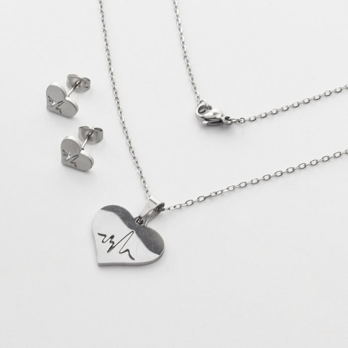 Komplet biżuterii ze stali chirurgicznej z kolczykami serce z linią życia w kolorze srebrnym 45cm