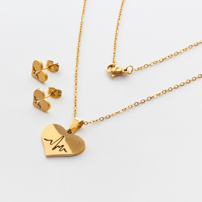 Komplet biżuterii ze stali chirurgicznej z kolczykami serce z linią życia w kolorze złotym 45cmTo estetyczny element biżuteryjny ze stali chirurgicznej 316L, chętnie wybierany do nowoczesnych projektów. To materiał chętnie wybierany do biżuterii handmade ze względu na trwałość, estetykę i wygodę użytkowania.Komplet biżuterii ze stali chirurgicznej 316L to spójnie zaprojektowany zestaw, który łączy estetykę z wygodą codziennego użytkowania. Dzięki dopasowanym elementom dobrze prezentuje się jako gotowa biżuteria i ułatwia stworzenie harmonijnej stylizacji.Rozmiar