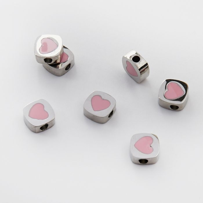 Koralik ze stali chirurgicznej emaliowany różowe serce w kolorze srebrnym 8x8mm