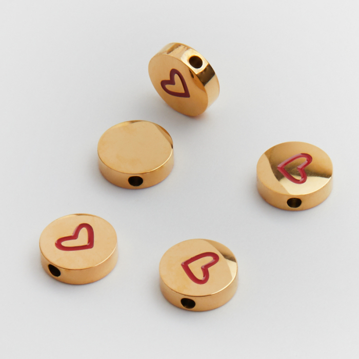Koralik ze stali chirurgicznej krążek z serduszkiem emaliowanym w kolorze złotym 8mm PVDTo starannie wykonany element do tworzenia biżuterii handmade. To materiał chętnie wybierany do biżuterii handmade ze względu na trwałość, estetykę i wygodę użytkowania. Wykończenie w kolorze złotym uzyskane metodą PVD.Element ozdobny ze stali chirurgicznej 316L może pełnić funkcję koralika, przekładki lub subtelnego detalu wykończeniowego w biżuterii handmade. Tego typu półfabrykaty pomagają uporządkować kompozycję, oddzielić większe elementy i nadać projektowi bardziej dopracowany wygląd.Rozmiar