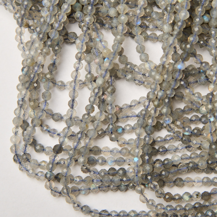Fasetowane kulki labradorytu w kolorze szarym, lekko przezroczyste. W niektórych kuleczkach mocno widoczny efekt labradoryzacji, czyli przenikania się barw głównie koloru niebieskiego. Miejscamy występuja inkluzje innych minerałów.Ponieważ są to kamienie naturalne, mogą nieznacznie różnić się wielkością między sobą. Charakterystyka: