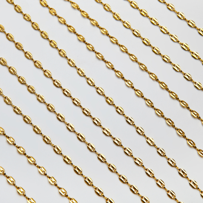 Łańcszek fasolki ze stali chirurgicznej w kolorze złotym 7,5x5mmTo trwały i estetyczny element do tworzenia biżuterii handmade. Stal szlachetna dobrze sprawdza się w biżuterii noszonej na co dzień, ponieważ łączy trwałość z estetycznym wykończeniem.Łańcuszek ze stali szlachetnej to praktyczna baza do tworzenia naszyjników, bransoletek i innych projektów biżuteryjnych. Może pełnić funkcję gotowego elementu nośnego albo stanowić część większej kompozycji z zawieszkami, łącznikami czy detalami dekoracyjnymi.Rozmiar