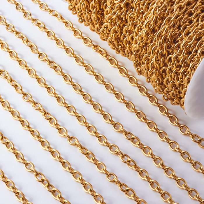 Łańcuch ze stali chirurgicznej owal gładki w kolorze złotym 8x6mm PVDTo trwały i estetyczny element do tworzenia biżuterii handmade. Stal chirurgiczna 316L jest ceniona za odporność na korozję i estetyczny wygląd w codziennym użytkowaniu. Wykończenie w kolorze złotym uzyskane metodą PVD.Łańcuszek ze stali chirurgicznej 316L to praktyczna baza do tworzenia naszyjników, bransoletek i innych projektów biżuteryjnych. Może pełnić funkcję gotowego elementu nośnego albo stanowić część większej kompozycji z zawieszkami, łącznikami czy detalami dekoracyjnymi.Rozmiar