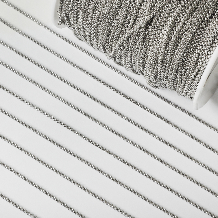 Łańcuszek rolo ze stali chirurgicznej w kolorze srebrnym 2mmTo funkcjonalny komponent do biżuterii handmade. Stal szlachetna dobrze sprawdza się w biżuterii noszonej na co dzień, ponieważ łączy trwałość z estetycznym wykończeniem.Łańcuszek ze stali szlachetnej to praktyczna baza do tworzenia naszyjników, bransoletek i innych projektów biżuteryjnych. Może pełnić funkcję gotowego elementu nośnego albo stanowić część większej kompozycji z zawieszkami, łącznikami czy detalami dekoracyjnymi.Rozmiar