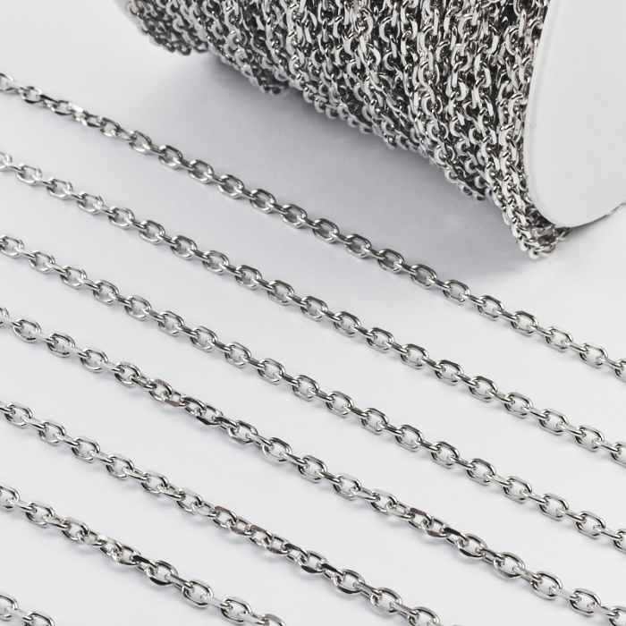 Łańcuszek ze stali chirurgicznej owale fasetowane w kolorze srebrnym 5x3mmTo funkcjonalny komponent do biżuterii handmade. Stal chirurgiczna 316L jest ceniona za odporność na korozję i estetyczny wygląd w codziennym użytkowaniu.Łańcuszek ze stali chirurgicznej 316L to praktyczna baza do tworzenia naszyjników, bransoletek i innych projektów biżuteryjnych. Może pełnić funkcję gotowego elementu nośnego albo stanowić część większej kompozycji z zawieszkami, łącznikami czy detalami dekoracyjnymi.Rozmiar