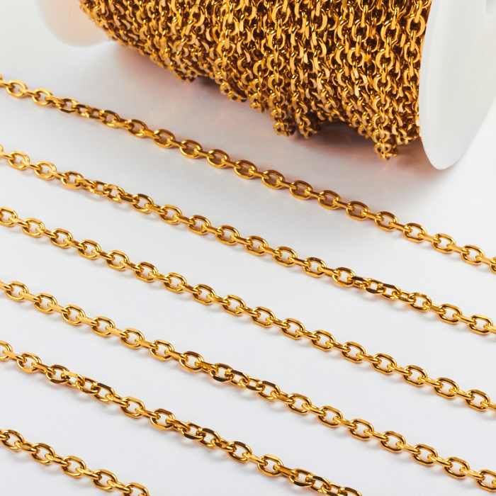 Łańcuszek ze stali chirurgicznej owale fasetowane w kolorze złotym 5x3,5mmTo uniwersalny element wykończeniowy i dekoracyjny do projektów jubilerskich. To materiał chętnie wybierany do biżuterii handmade ze względu na trwałość, estetykę i wygodę użytkowania.Łańcuszek ze stali chirurgicznej 316L to praktyczna baza do tworzenia naszyjników, bransoletek i innych projektów biżuteryjnych. Może pełnić funkcję gotowego elementu nośnego albo stanowić część większej kompozycji z zawieszkami, łącznikami czy detalami dekoracyjnymi.Rozmiar