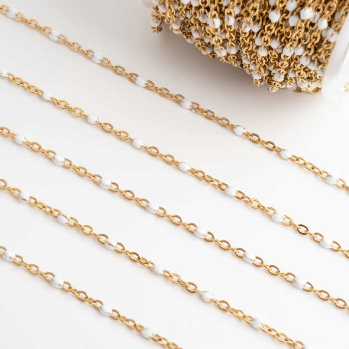 Łańcuszek ze stali chirurgicznej z koralikami białymi w kolorze złotym 2mm PVDTo praktyczny półfabrykat do projektów biżuteryjnych. Stal chirurgiczna 316L jest ceniona za odporność na korozję i estetyczny wygląd w codziennym użytkowaniu. Wykończenie w kolorze złotym uzyskane metodą PVD.Element ozdobny ze stali chirurgicznej 316L może pełnić funkcję koralika, przekładki lub subtelnego detalu wykończeniowego w biżuterii handmade. Tego typu półfabrykaty pomagają uporządkować kompozycję, oddzielić większe elementy i nadać projektowi bardziej dopracowany wygląd.Rozmiar