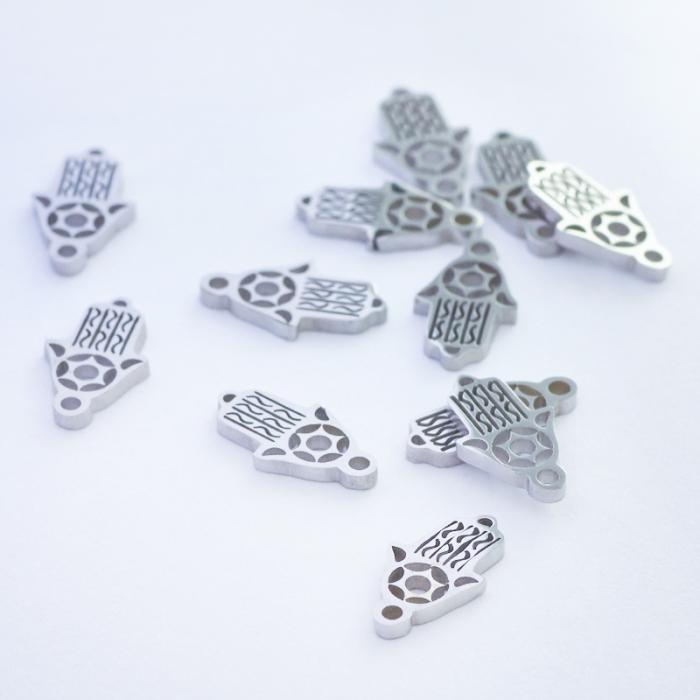 Mini łącznik ze stali chirurgicznej ręka Fatimy w kolorze srebrnym 10,5mmTo praktyczny półfabrykat do projektów biżuteryjnych. To materiał chętnie wybierany do biżuterii handmade ze względu na trwałość, estetykę i wygodę użytkowania.Łącznik ze stali chirurgicznej 316L to praktyczny i dekoracyjny element, który pozwala w estetyczny sposób połączyć różne części biżuterii. Sprawdza się w bransoletkach, naszyjnikach i kolczykach, gdzie liczy się zarówno funkcjonalność, jak i spójny wygląd projektu.Forma lub motyw