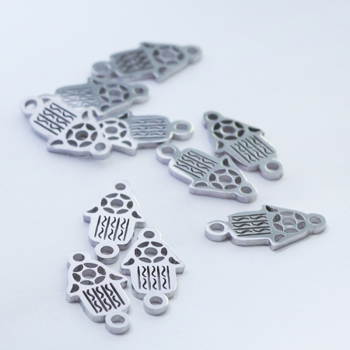 Mini łącznik ze stali chirurgicznej ręka Fatimy w kolorze srebrnym 10mmTo starannie wykonany element do tworzenia biżuterii handmade. Stal chirurgiczna 316L jest ceniona za odporność na korozję i estetyczny wygląd w codziennym użytkowaniu.Łącznik ze stali chirurgicznej 316L to praktyczny i dekoracyjny element, który pozwala w estetyczny sposób połączyć różne części biżuterii. Sprawdza się w bransoletkach, naszyjnikach i kolczykach, gdzie liczy się zarówno funkcjonalność, jak i spójny wygląd projektu.Forma lub motyw