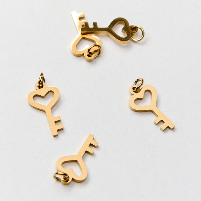 Mini zawieszka ze stali chirurgicznej kluczyk z serduszkiem w kolorze złotym 13mm PVDTo estetyczny element biżuteryjny ze stali chirurgicznej 316L, chętnie wybierany do nowoczesnych projektów. W biżuterii handmade stal chirurgiczna 316L jest ceniona za dobry wygląd, odporność na korozję i wygodę codziennego użytkowania. Wykończenie w kolorze złotym uzyskane metodą PVD.Zawieszka ze stali chirurgicznej 316L to dekoracyjny element, który nadaje biżuterii charakteru i pozwala tworzyć spersonalizowane projekty. Świetnie sprawdza się w naszyjnikach, bransoletkach, kolczykach oraz drobnych charmsach.Forma lub motyw