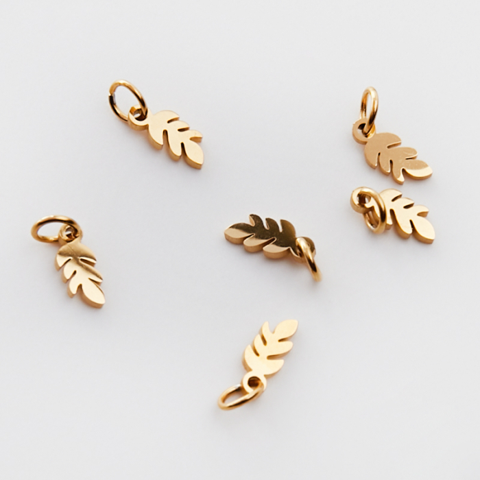Mini zawieszka ze stali chirurgicznej listek w kolorze złotym 8,5mm PVDTo estetyczny element biżuteryjny ze stali chirurgicznej 316L, chętnie wybierany do nowoczesnych projektów. Stal chirurgiczna 316L jest ceniona za odporność na korozję i estetyczny wygląd w codziennym użytkowaniu. Wykończenie w kolorze złotym uzyskane metodą PVD.Zawieszka ze stali chirurgicznej 316L to dekoracyjny element, który nadaje biżuterii charakteru i pozwala tworzyć spersonalizowane projekty. Świetnie sprawdza się w naszyjnikach, bransoletkach, kolczykach oraz drobnych charmsach.Forma lub motyw