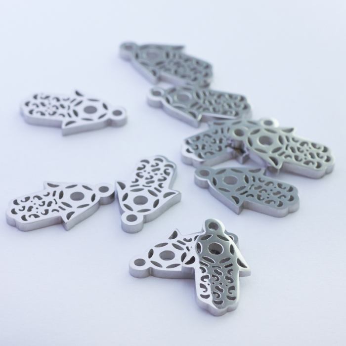 Mini zawieszka ze stali chirurgicznej ręka Fatimy w kolorze srebrnym 15mmTo estetyczny element biżuteryjny ze stali chirurgicznej 316L, chętnie wybierany do nowoczesnych projektów. W biżuterii handmade stal chirurgiczna 316L jest ceniona za dobry wygląd, odporność na korozję i wygodę codziennego użytkowania.Zawieszka ze stali chirurgicznej 316L to dekoracyjny element, który nadaje biżuterii charakteru i pozwala tworzyć spersonalizowane projekty. Świetnie sprawdza się w naszyjnikach, bransoletkach, kolczykach oraz drobnych charmsach.Forma lub motyw