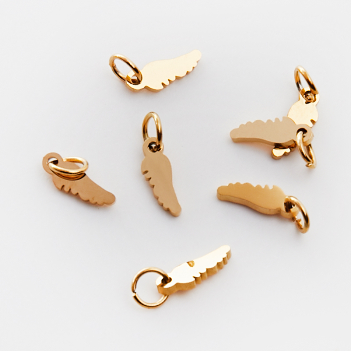 Mini zawieszka ze stali chirurgicznej skrzydełko pełne w kolorze złotym 8,5mm PVDTo estetyczny element biżuteryjny ze stali chirurgicznej 316L, chętnie wybierany do nowoczesnych projektów. Stal chirurgiczna 316L jest ceniona za odporność na korozję i estetyczny wygląd w codziennym użytkowaniu. Wykończenie w kolorze złotym uzyskane metodą PVD.Zawieszka ze stali chirurgicznej 316L to dekoracyjny element, który nadaje biżuterii charakteru i pozwala tworzyć spersonalizowane projekty. Świetnie sprawdza się w naszyjnikach, bransoletkach, kolczykach oraz drobnych charmsach.Forma lub motyw