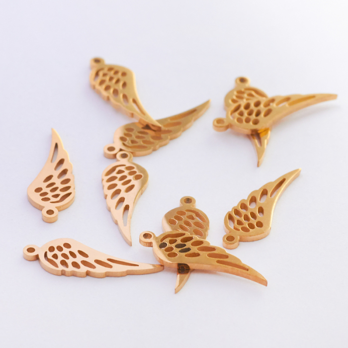 Mini zawieszka ze stali chirurgicznej skrzydełko w kolorze złotym 14,5mmTo dopracowany produkt ze stali chirurgicznej 316L, który łączy praktyczność z estetycznym wyglądem. W biżuterii handmade stal chirurgiczna 316L jest ceniona za dobry wygląd, odporność na korozję i wygodę codziennego użytkowania.Zawieszka ze stali chirurgicznej 316L to dekoracyjny element, który nadaje biżuterii charakteru i pozwala tworzyć spersonalizowane projekty. Świetnie sprawdza się w naszyjnikach, bransoletkach, kolczykach oraz drobnych charmsach.Forma lub motyw