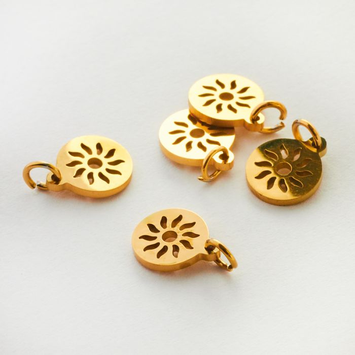 Mini zawieszka ze stali chirurgicznej słoneczko w kółku w kolorze złotym 8mm PVD