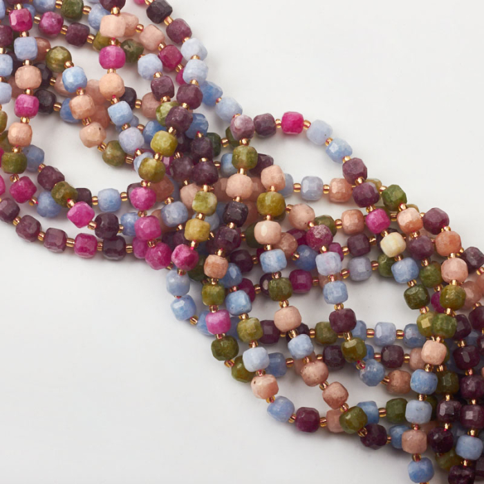 Kamienie naturalne wykonane z mixu kamieni w kształcie kostki fasetowanej. Kamienie są w różnych kolorach np.: różowym, niebieskim, fioletowym, zielonym, kremowym, brzoskwiniowym, mlecznym. Posiadają naturalnie powstałe przebarwienia. Na powierzchni widoczne są ślady fasetowania.*Ponieważ są to kamienie naturalne mogą się nieznacznie różnić od siebie rozmiarem.*Rozmiar podany w nazwie produktu jest wartością orientacyjną. Charakterystyka: