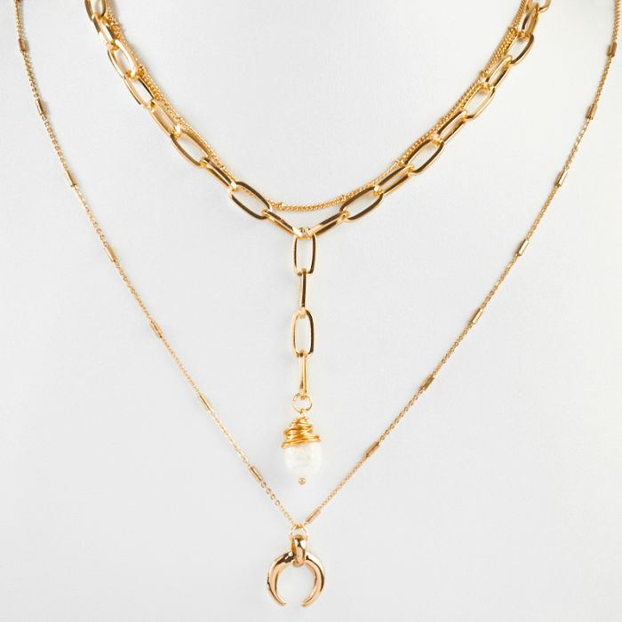 Naszyjnik z grubych łańcuszków z perłą i rogiem obfitości złoty 44,5cm