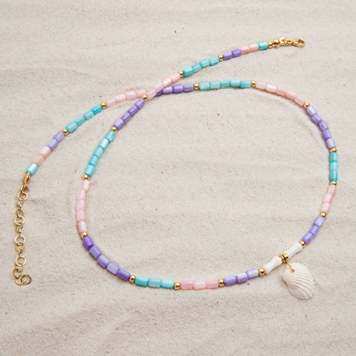 Przejdź do tutorialuOpis Letni naszyjnik stworzony z koralików w kształcie walca z masy perłowej w jasnoróżowych, turkusowych i fioletowych odcieniach. Całość uzupełniona jest elementami ze stali chirurgicznej oraz ozdobnym akcentem z naturalnej muszli, który dodaje całości delikatnego, plażowego charakteru.Połyskująca masa perłowa w pastelowej palecie pięknie odbija światło, a lekkość formy sprawia, że naszyjnik doskonale sprawdzi się jako codzienny dodatek w ciepłe, słoneczne dni. Stal chirurgiczna zapewnia trwałość i odporność na wilgoć, dzięki czemu biżuteria świetnie nadaje się na wakacyjne wyjazdy.Naszyjnik posiada zapięcie typu karabińczyk oraz przedłużkę, która pozwala regulować jego długość w obrębie 5 cm.To idealny wybór na lato — subtelny, a zarazem przyciągający uwagę, świetnie komponuje się z lnianymi sukienkami, topami na ramiączkach czy plażowymi stylizacjami.