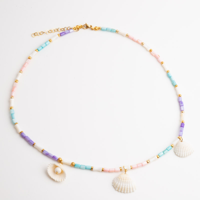 Przejdź do tutorialuOpis Letni naszyjnik stworzony z koralików w kształcie walca z masy perłowej w jasnoróżowych, turkusowych i fioletowych odcieniach. Całość uzupełniona jest elementami ze stali chirurgicznej oraz ozdobnym akcentem z naturalnej muszli, który dodaje całości delikatnego, plażowego charakteru.Połyskująca masa perłowa w pastelowej palecie pięknie odbija światło, a lekkość formy sprawia, że naszyjnik doskonale sprawdzi się jako codzienny dodatek w ciepłe, słoneczne dni. Stal chirurgiczna zapewnia trwałość i odporność na wilgoć, dzięki czemu biżuteria świetnie nadaje się na wakacyjne wyjazdy.Naszyjnik posiada zapięcie typu karabińczyk oraz przedłużkę, która pozwala regulować jego długość w obrębie 5 cm.To idealny wybór na lato — subtelny, a zarazem przyciągający uwagę, świetnie komponuje się z lnianymi sukienkami, topami na ramiączkach czy plażowymi stylizacjami.