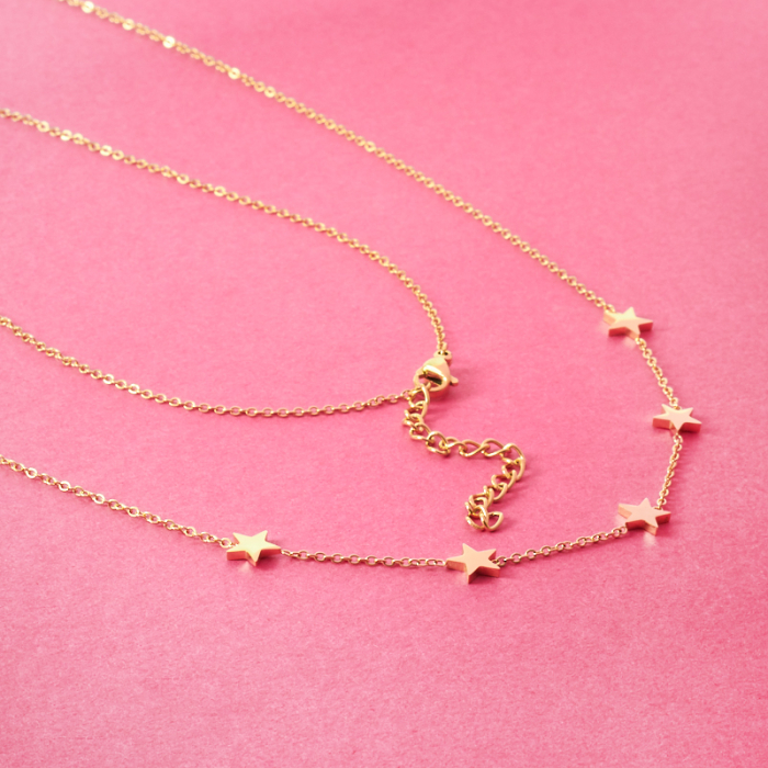 Naszyjnik z mini zawieszkami ze stali chirurgicznej gwiazdki w kolorze złotym 39,5cmTo trwały element biżuterii lub półfabrykat jubilerski, który dobrze sprawdza się w codziennych realizacjach. To materiał chętnie wybierany do biżuterii handmade ze względu na trwałość, estetykę i wygodę użytkowania.Naszyjnik ze stali chirurgicznej 316L to gotowy element biżuterii lub baza do dalszego personalizowania, w zależności od konstrukcji produktu. Dobrze sprawdza się w codziennym noszeniu i pozwala łatwo dopasować styl projektu do pozostałych dodatków.Rozmiar