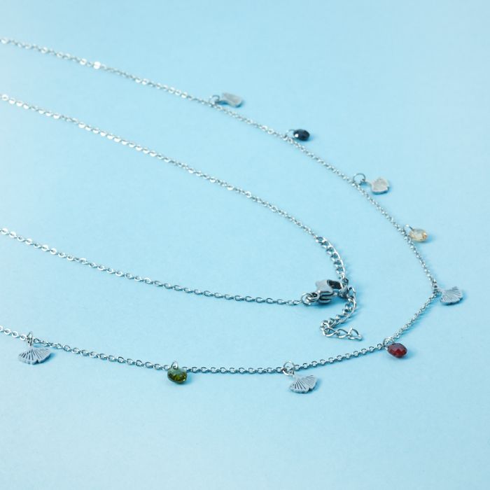 Naszyjnik z mini zawieszkami ze stali chirurgicznej liść miłorzębu i cyrkoniami w kolorze srebrnym 41cm