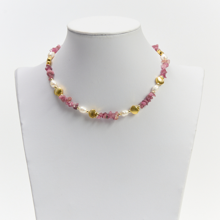 Naszyjnik z różowym turmalinem, perłą i muszelkami z hematytu