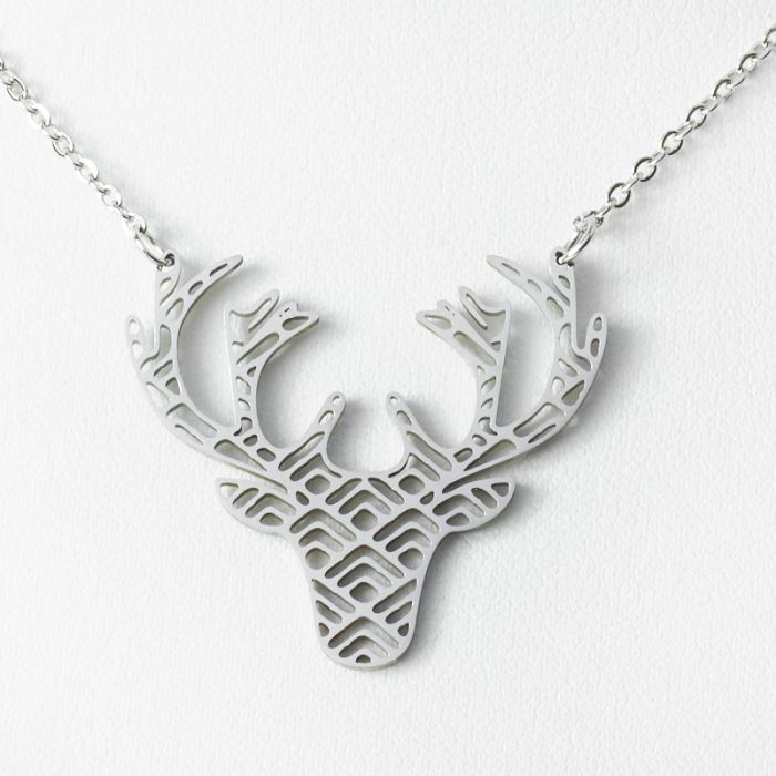 Naszyjnik ze stali chirurgicznej w kolorze srebrnym. Ażurowy element ozdobny z motywem jelenia doczepiony jest kółeczkami zaciskowymi do łańcuszka z drobnych, owalnych ogniw. Wykończony klasycznym zapięciem typu karabińczyk.