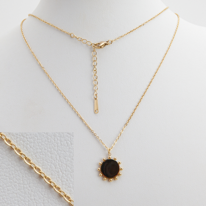 Naszyjnik ze stali chirurgicznej z ozdobnym kółkiem z onyksem w kolorze złotym 47cm PVDTo trwały element biżuterii lub półfabrykat jubilerski, który dobrze sprawdza się w codziennych realizacjach. To materiał chętnie wybierany do biżuterii handmade ze względu na trwałość, estetykę i wygodę użytkowania. Wykończenie w kolorze złotym uzyskane metodą PVD.Naszyjnik ze stali chirurgicznej 316L to gotowy element biżuterii lub baza do dalszego personalizowania, w zależności od konstrukcji produktu. Dobrze sprawdza się w codziennym noszeniu i pozwala łatwo dopasować styl projektu do pozostałych dodatków.Rozmiar