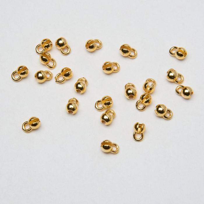 Stylowe końcówki w formie gładkiej „kulki” z oczkiem do podpięcia zapięcia lub łańcuszka. Wykonane z mosiądzu pokrytego warstwą 14-karatowego złota próby 585 metodą galwaniczną, co nadaje im elegancki, ciepły odcień. Posiadają otwór 1,2 mm odpowiedni dla nici, sznurków, gumek i linek stalowych.