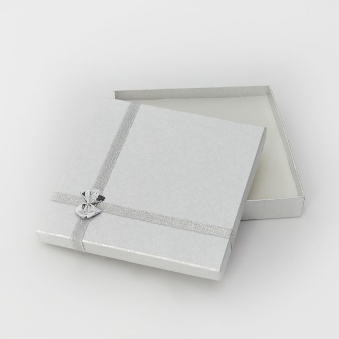 Pudełko ozdobne do biżuterii srebrne z kokardką 15x15x2,8cm