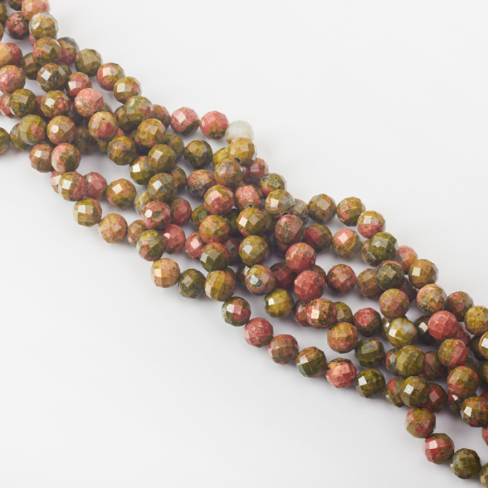 Kamienie naturalne wykonane z unakitu w kształcie kulki fasetowanej. Kamienie są w odcieniu zielonym, pomieszanym z brązowym, pomarańczowych oraz czarnym. Kulki posiadają naturalnie powstałe wrostki.*Ponieważ są to kamienie naturalne mogą się nieznacznie różnić od siebie rozmiarem.*Rozmiar podany w nazwie produktu jest wartością orientacyjną. Charakterystyka: