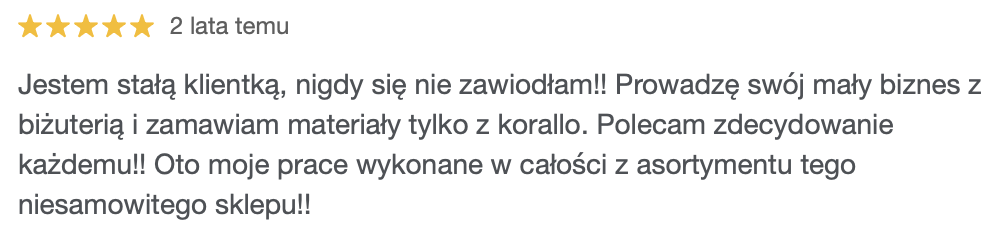 Najważniejszy z nich zakłada, że każdy z Was opuszczając naszą stronę powinien być zadowolony i mieć uśmiech na ustach, że udało mu się znaleźć to, czego szukał. Właśnie dlatego codziennie, w pocie czoła, pracujemy, aby w sklepie nie brakowało Waszych ulubionych koralików i promocji.