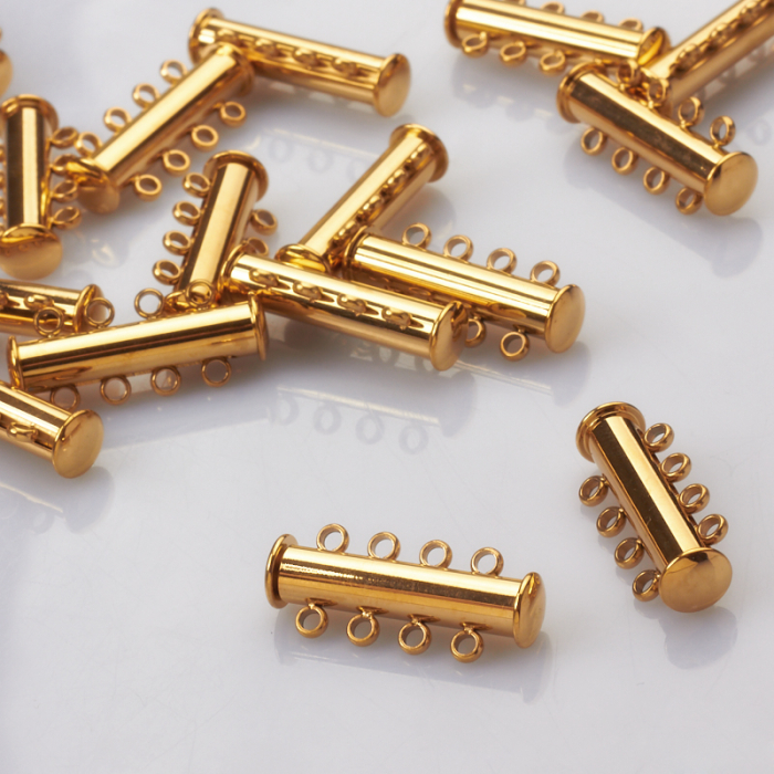 Zapięcie rozsuwane 4 sznurki ze stali chirurgicznej w kolorze złotym 25mmTo funkcjonalny komponent do biżuterii handmade. Stal chirurgiczna 316L jest ceniona za odporność na korozję i estetyczny wygląd w codziennym użytkowaniu.Zapięcie ze stali chirurgicznej 316L w kolorze