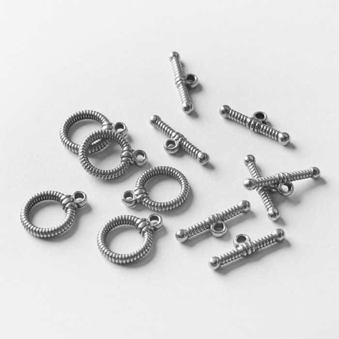 Zapięcie toggle ze stali chirurgicznej nacinane w kolorze srebrnym 12mmTo uniwersalny element wykończeniowy i dekoracyjny do projektów jubilerskich. W biżuterii handmade stal chirurgiczna 316L jest ceniona za dobry wygląd, odporność na korozję i wygodę codziennego użytkowania.Zapięcie ze stali chirurgicznej 316L w kolorze