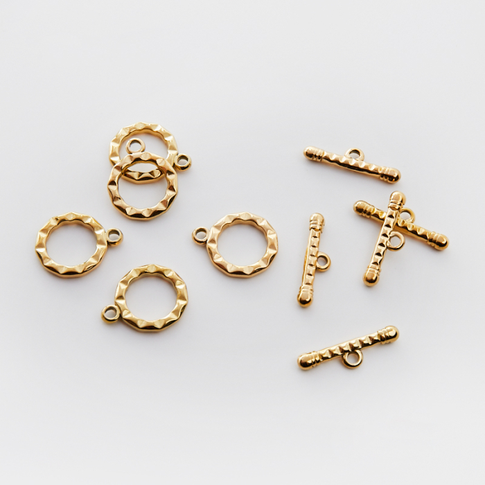 Zapięcie toggle ze stali chirurgicznej nacinane w kolorze złotym 16mm PVDTo trwały i estetyczny element do tworzenia biżuterii handmade. W biżuterii handmade stal chirurgiczna 316L jest ceniona za dobry wygląd, odporność na korozję i wygodę codziennego użytkowania. Wykończenie w kolorze złotym uzyskane metodą PVD.Zapięcie ze stali chirurgicznej 316L w kolorze