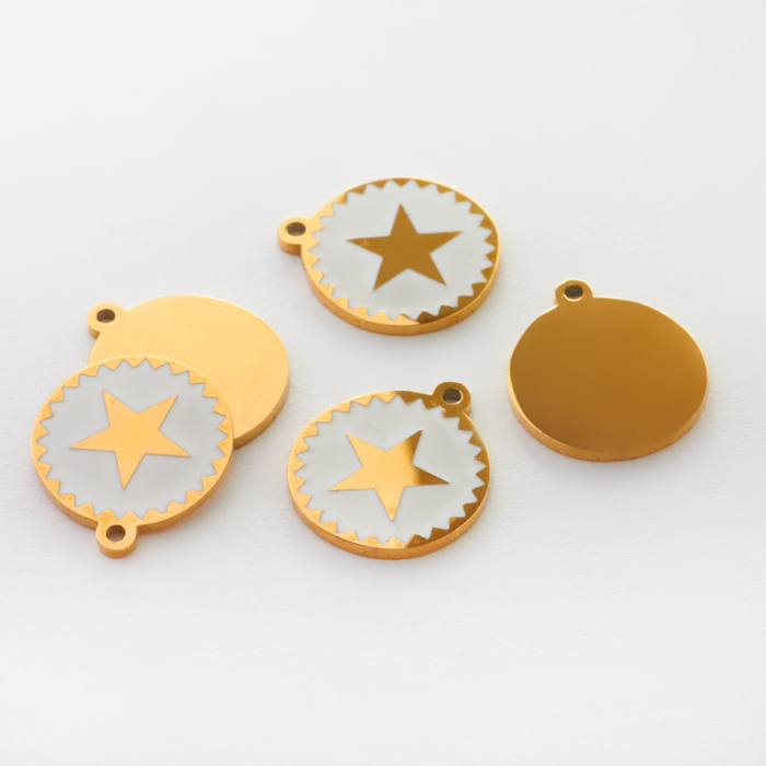 Zawieszka emaliowana kółko ze stali chirurgicznej w kolorze złotym gwiazdka biała 13mmTo estetyczny element biżuteryjny ze stali chirurgicznej 316L, chętnie wybierany do nowoczesnych projektów. W biżuterii handmade stal chirurgiczna 316L jest ceniona za dobry wygląd, odporność na korozję i wygodę codziennego użytkowania.Zawieszka ze stali chirurgicznej 316L to dekoracyjny element, który nadaje biżuterii charakteru i pozwala tworzyć spersonalizowane projekty. Świetnie sprawdza się w naszyjnikach, bransoletkach, kolczykach oraz drobnych charmsach.Forma lub motyw