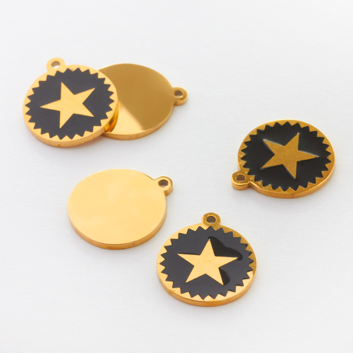 Zawieszka emaliowana kółko ze stali chirurgicznej w kolorze złotym gwiazdka czarna 13mmTo dopracowany produkt ze stali chirurgicznej 316L, który łączy praktyczność z estetycznym wyglądem. To materiał chętnie wybierany do biżuterii handmade ze względu na trwałość, estetykę i wygodę użytkowania.Zawieszka ze stali chirurgicznej 316L to dekoracyjny element, który nadaje biżuterii charakteru i pozwala tworzyć spersonalizowane projekty. Świetnie sprawdza się w naszyjnikach, bransoletkach, kolczykach oraz drobnych charmsach.Forma lub motyw