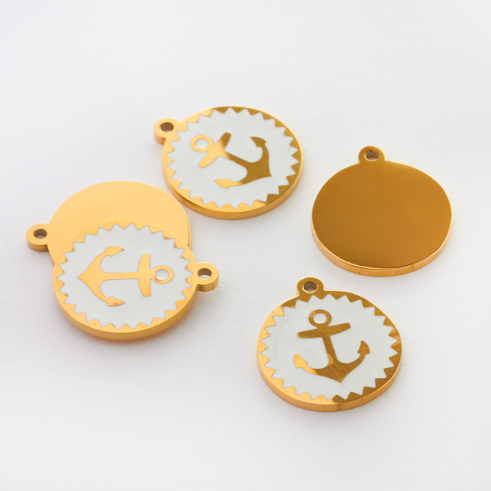 Zawieszka emaliowana kółko ze stali chirurgicznej w kolorze złotym kotwica biała 13mmTo starannie wykonany produkt ze stali chirurgicznej 316L, który dobrze prezentuje się w codziennym użytkowaniu. Stal chirurgiczna 316L dobrze sprawdza się w biżuterii noszonej na co dzień, ponieważ łączy trwałość z estetycznym wykończeniem.Zawieszka ze stali chirurgicznej 316L to dekoracyjny element, który nadaje biżuterii charakteru i pozwala tworzyć spersonalizowane projekty. Świetnie sprawdza się w naszyjnikach, bransoletkach, kolczykach oraz drobnych charmsach.Forma lub motyw