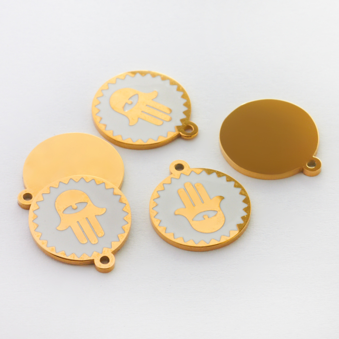 Zawieszka emaliowana kółko ze stali chirurgicznej w kolorze złotym ręka fatimy biała 13mm