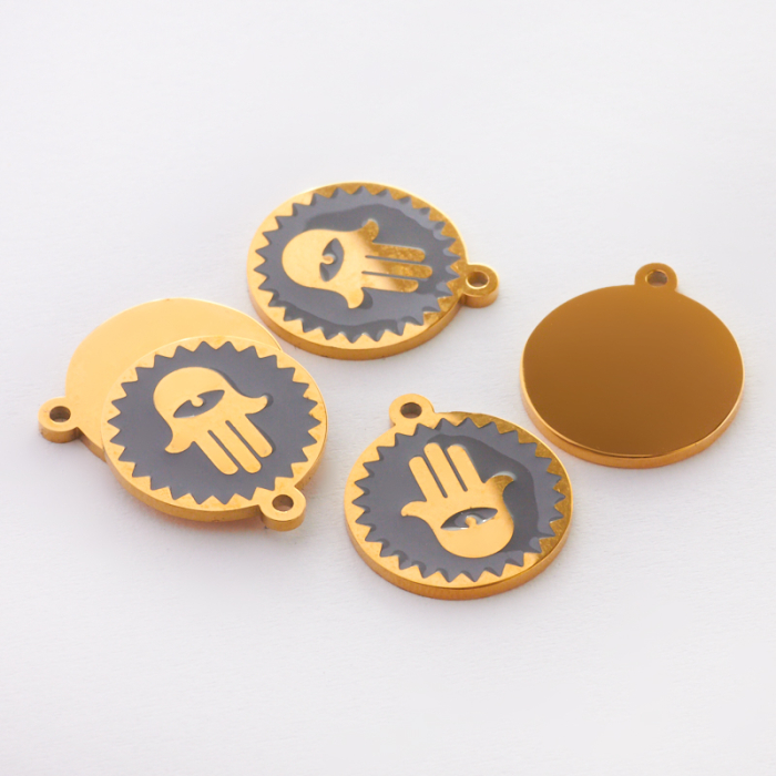 Zawieszka emaliowana kółko ze stali chirurgicznej w kolorze złotym ręka fatimy szara 13mmTo starannie wykonany produkt ze stali szlachetnej, który dobrze prezentuje się w codziennym użytkowaniu. W biżuterii handmade stal szlachetna jest ceniona za dobry wygląd, odporność na korozję i wygodę codziennego użytkowania.Zawieszka ze stali szlachetnej to dekoracyjny element, który nadaje biżuterii charakteru i pozwala tworzyć spersonalizowane projekty. Świetnie sprawdza się w naszyjnikach, bransoletkach, kolczykach oraz drobnych charmsach.Forma lub motyw
