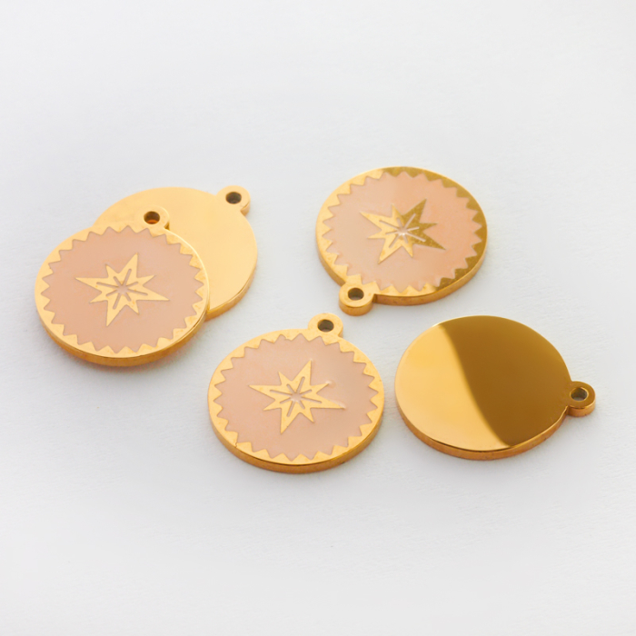 Zawieszka emaliowana kółko ze stali chirurgicznej w kolorze złotym róża wiatrów brzoskwiniowa 13mmTo dopracowany produkt ze stali chirurgicznej 316L, który łączy praktyczność z estetycznym wyglądem. W biżuterii handmade stal chirurgiczna 316L jest ceniona za dobry wygląd, odporność na korozję i wygodę codziennego użytkowania.Zawieszka ze stali chirurgicznej 316L to dekoracyjny element, który nadaje biżuterii charakteru i pozwala tworzyć spersonalizowane projekty. Świetnie sprawdza się w naszyjnikach, bransoletkach, kolczykach oraz drobnych charmsach.Forma lub motyw