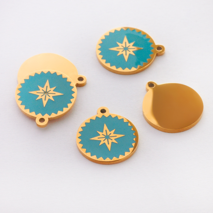 Zawieszka emaliowana kółko ze stali chirurgicznej w kolorze złotym róża wiatrów turkusowa 13mmTo starannie wykonany produkt ze stali szlachetnej, który dobrze prezentuje się w codziennym użytkowaniu. W biżuterii handmade stal szlachetna jest ceniona za dobry wygląd, odporność na korozję i wygodę codziennego użytkowania.Zawieszka ze stali szlachetnej to dekoracyjny element, który nadaje biżuterii charakteru i pozwala tworzyć spersonalizowane projekty. Świetnie sprawdza się w naszyjnikach, bransoletkach, kolczykach oraz drobnych charmsach.Forma lub motyw